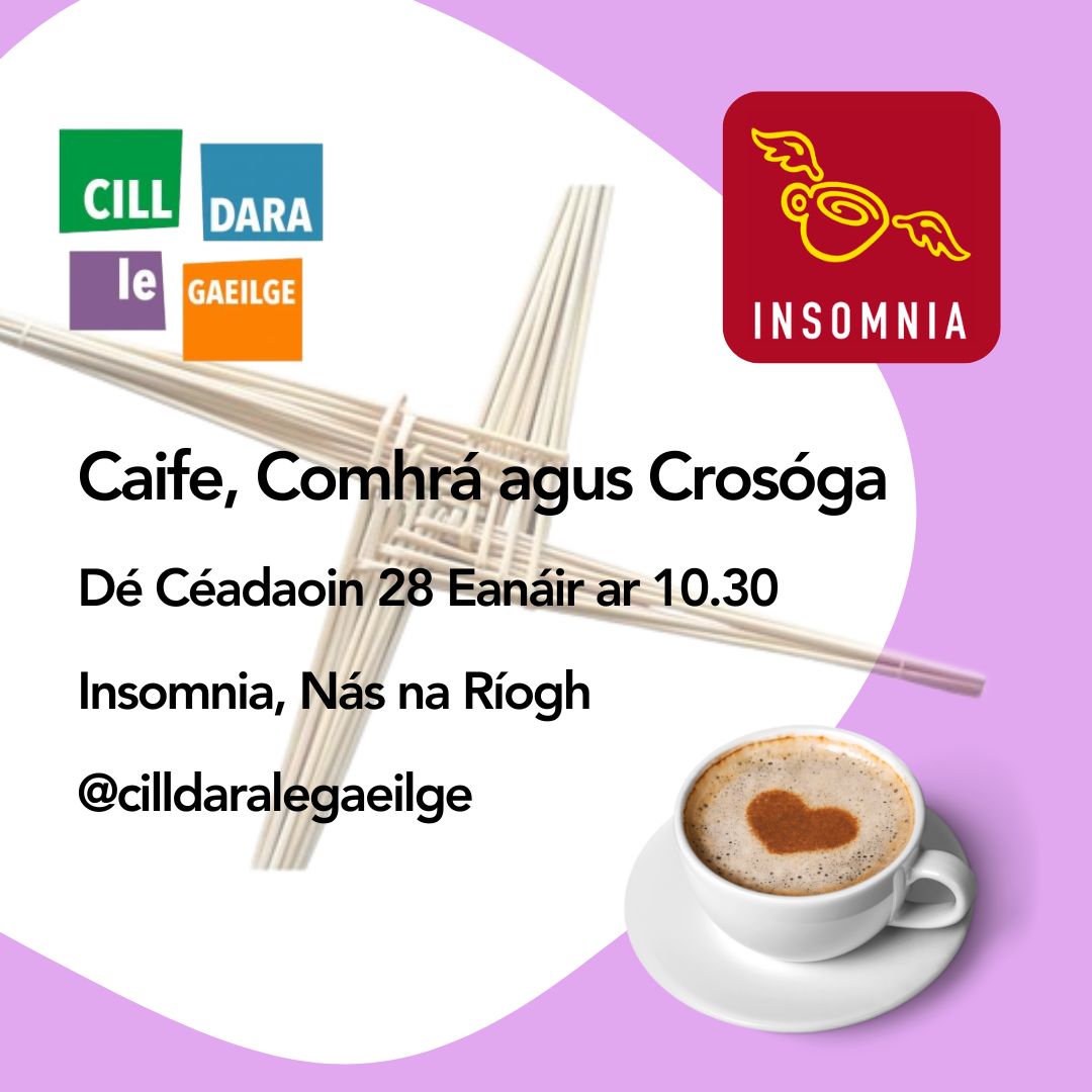 Deis cainte, caife agus cruthaitheachta! Beimid ag déanamh chrosóga Bhríde le Kate Dé Céadaoin an 28 Eanáir in Insomnia Nás na Ríogh. A chance to chat, have a coffee and be creative! Join us to make St Bridget's crosses with Kate in Insomnia on Wednesday 28 January in Insomnia in Naas. |