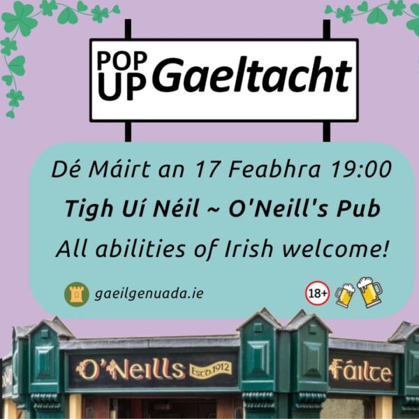 The first Popup Gaeltacht of the year! Tuesday, 7pm O’Neill’s Pub, Maynooth .
